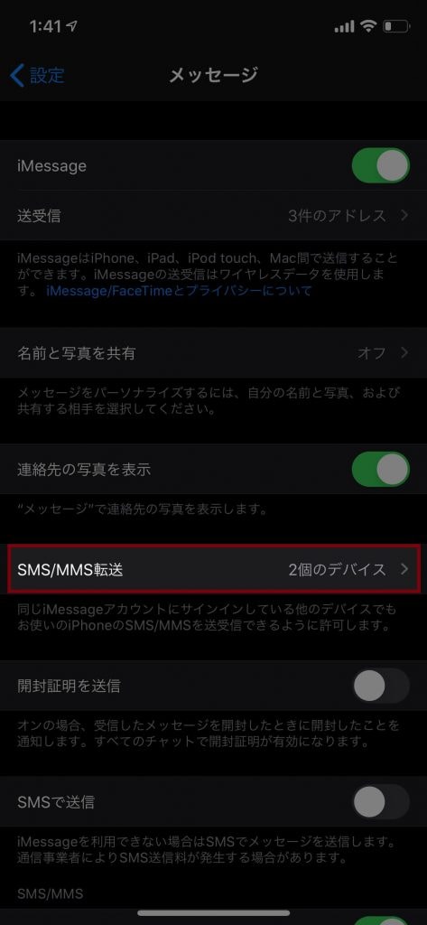 設定→メッセージをタップし、「SMS/MMS転送」をタップします。