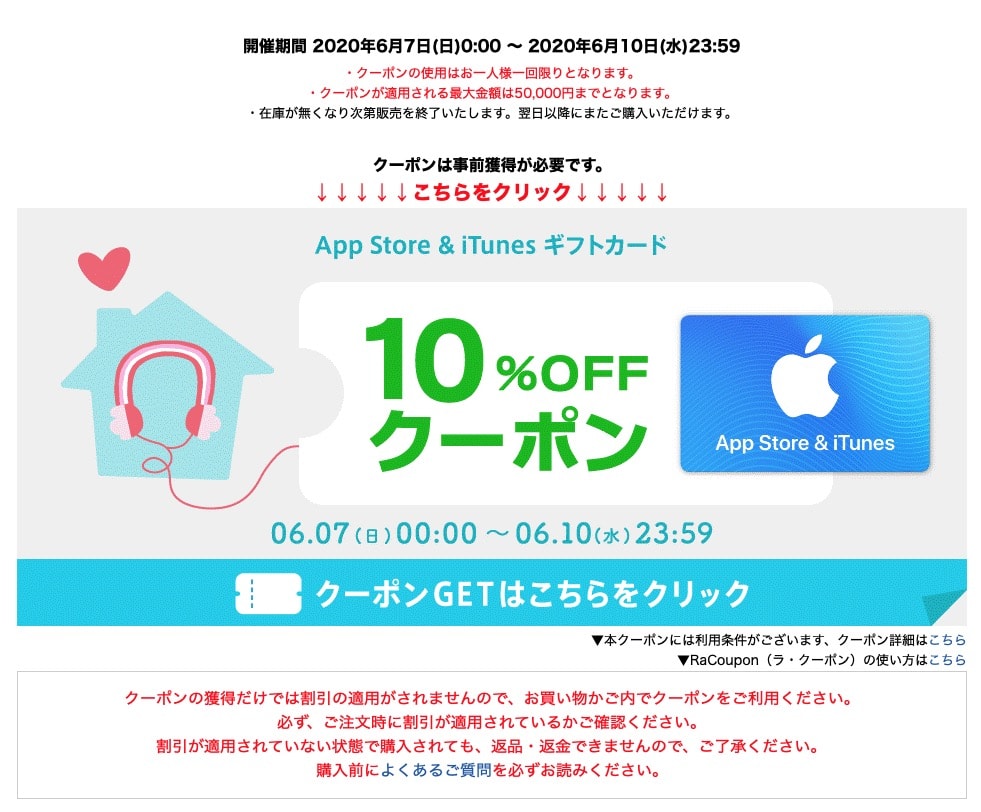 iTunes ギフトカード 10%OFF 6/7(日)~6/10(水)限定