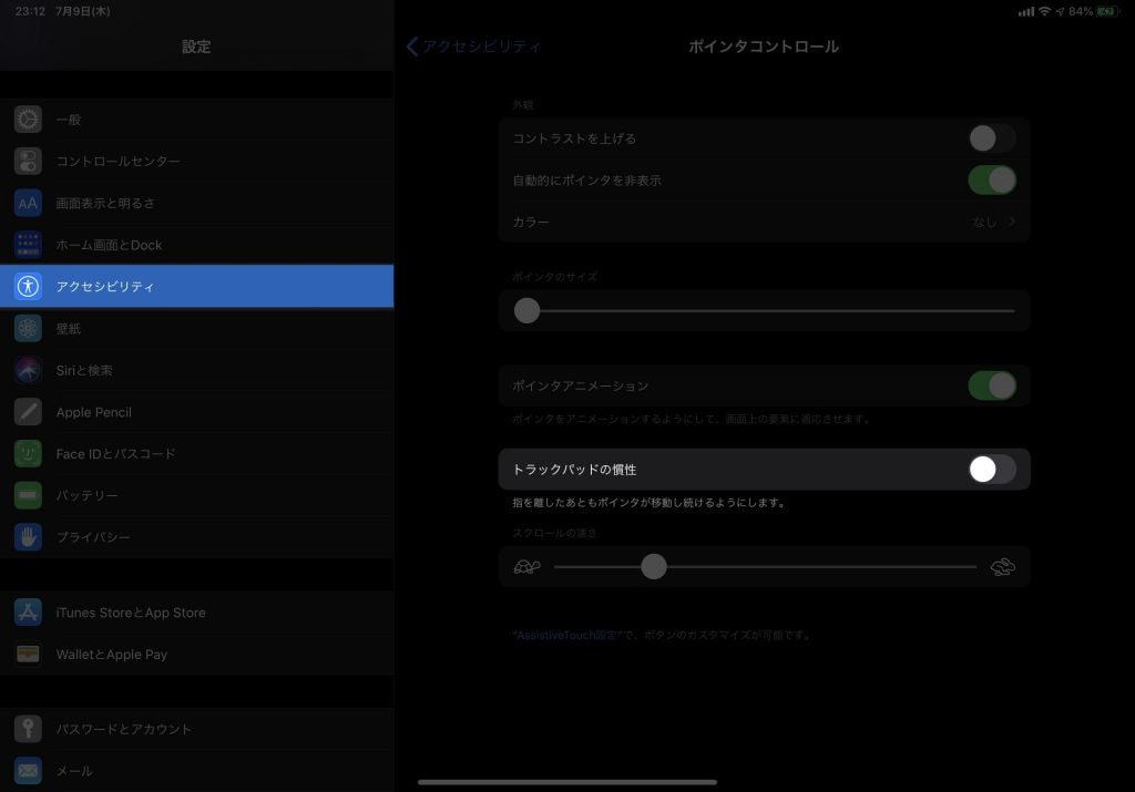 ※トラックパッドが接続されていない状態だと「ポインタコントロール」が表示されません。