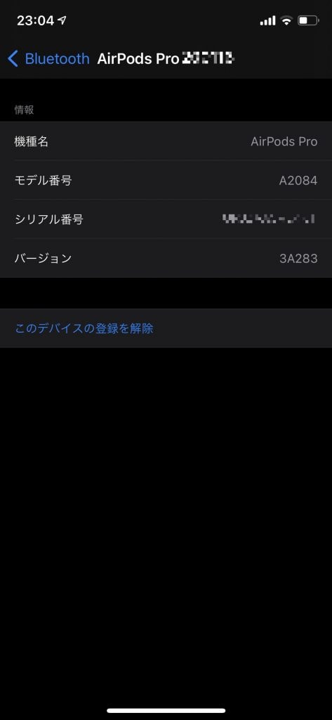 アップデートの完了の有無は「環境」→「Bluetooth」→「接続しているAirPods Pro右横の」をタップすることで確認できます。
