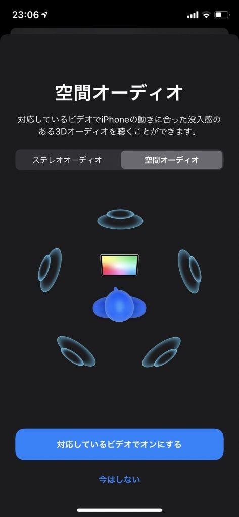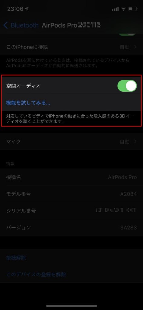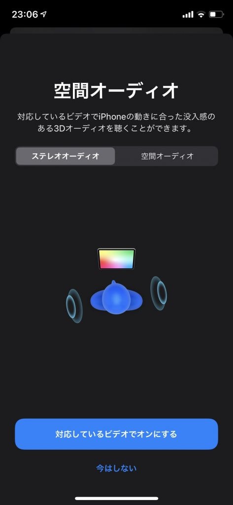 ファームウェアのアップデートが完了したらAirPods Proの設定画面で空間オーディオを試すことができます。