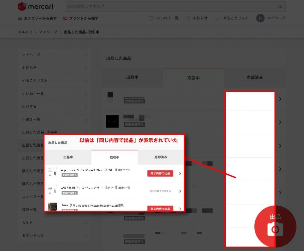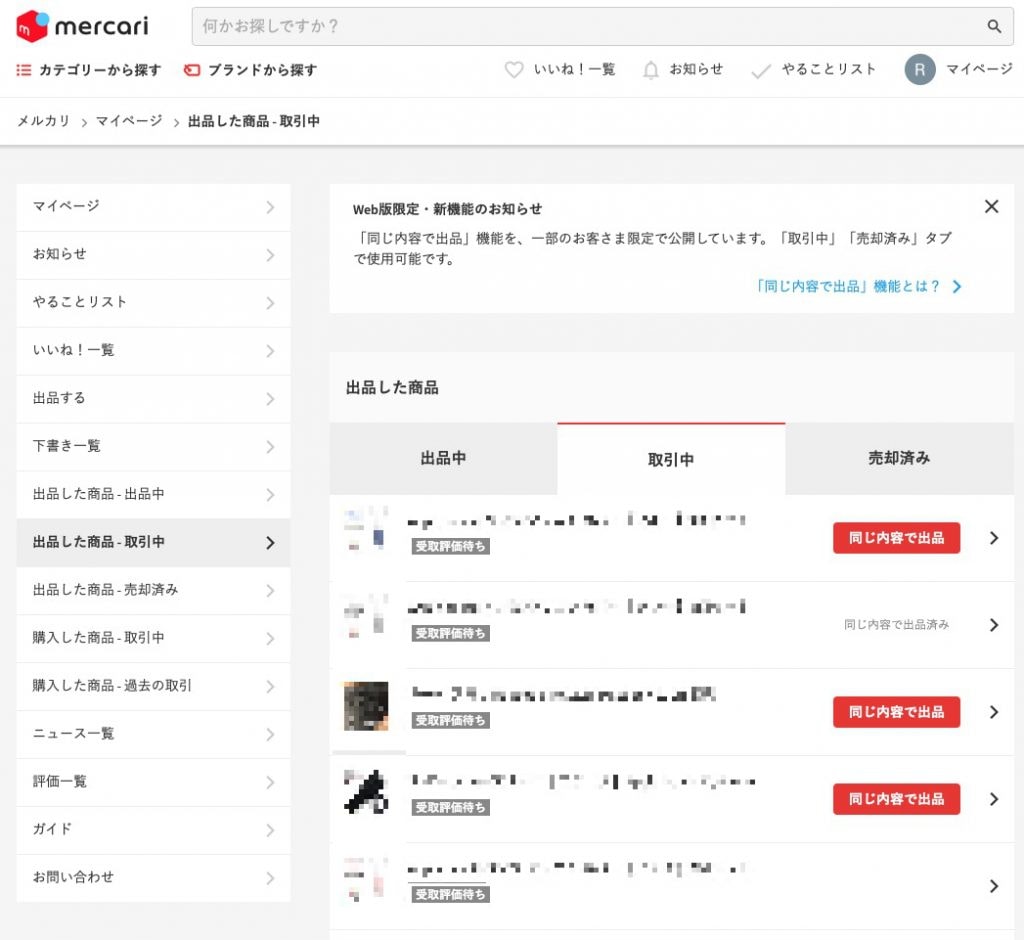 取引中タブまたは売却済みにある商品右に「同じ内容で出品」ボランが追加されています。