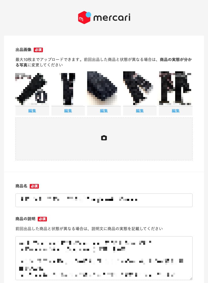 出品画面に遷移し既に情報が全て入力された状態となります。状態としては新規出品から情報を入力した状態と同じなので画像の変更、タイトルや説明文、価格の変更も可能なようです。