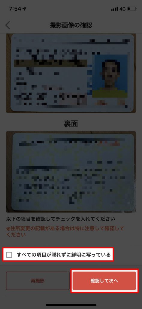 撮影が完了したら、「免許証の厚み」がしっかり確認できる写真かを確認し問題なければ「確認して次へ」をタップします。