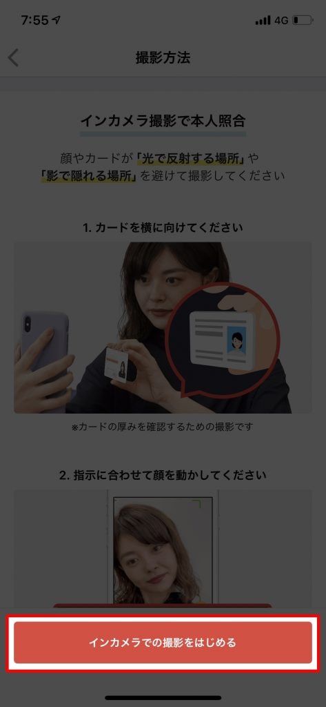 次に、免許証の厚みを撮影します。厚みの撮影時には自身の顔の認証も含まれています。