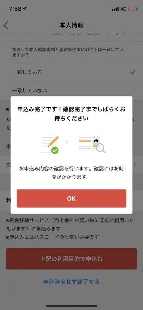 入力後、問題なければ「上記の利用目的で申込む」をタップし、「この内容で申込みますか?」のアラート内の「OK」をタップします。