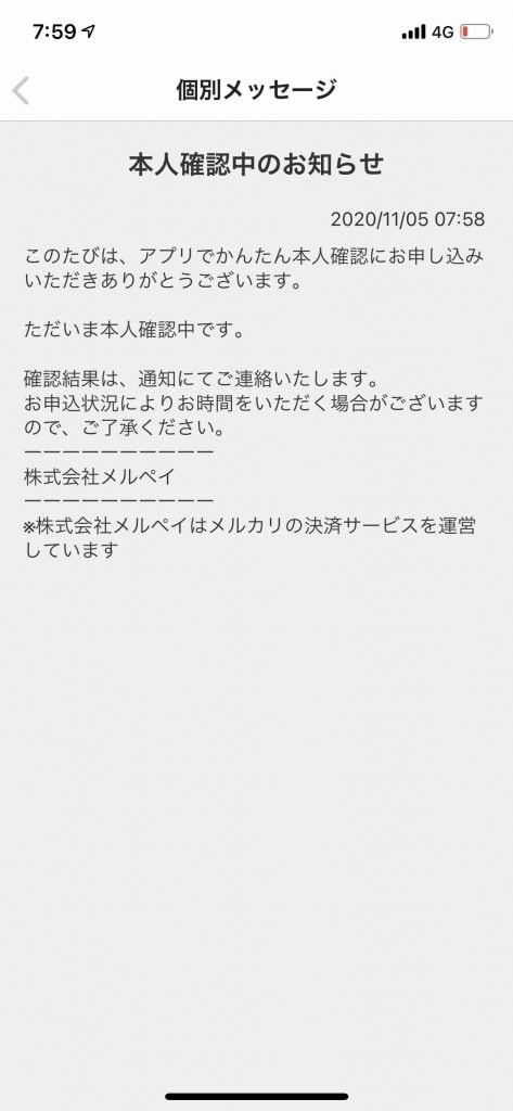 メッセージ内にも記載がありますが、本人確認の手続き完了には時間がかかるようです。