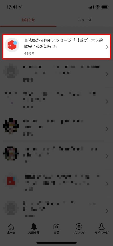 本日「メルカリ」アプリのお知らせで「事務局からの個別メッセージ「【重要】本人確認完了のお知らせ」」が届きました。