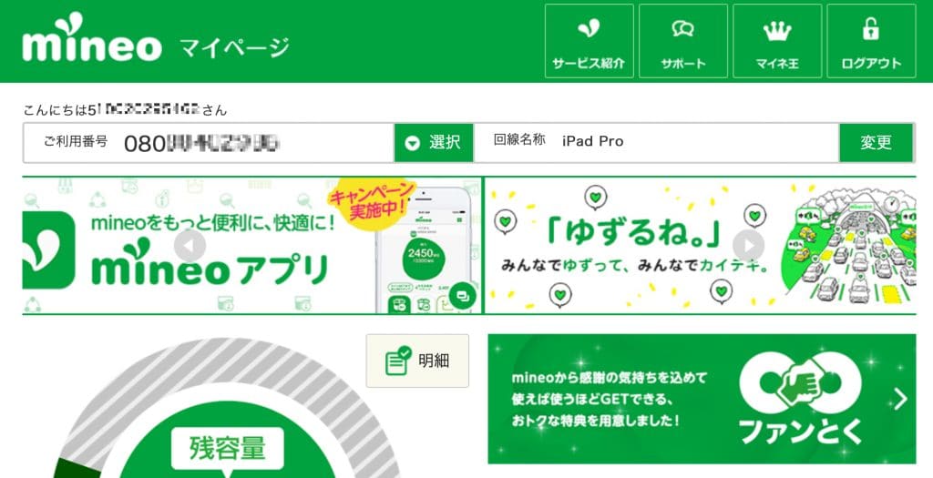 1回線のみの場合はマイページトップの左上部に記載されています。