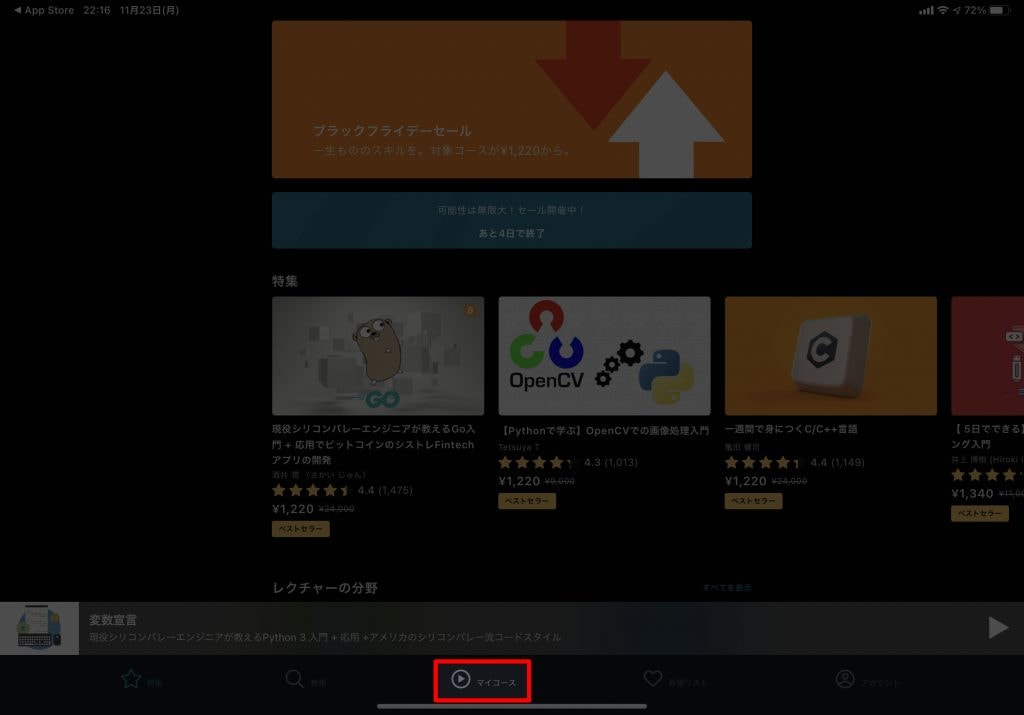ログインが完了すると、Udemyのトップが表示されるので、「マイコース」をタップします。