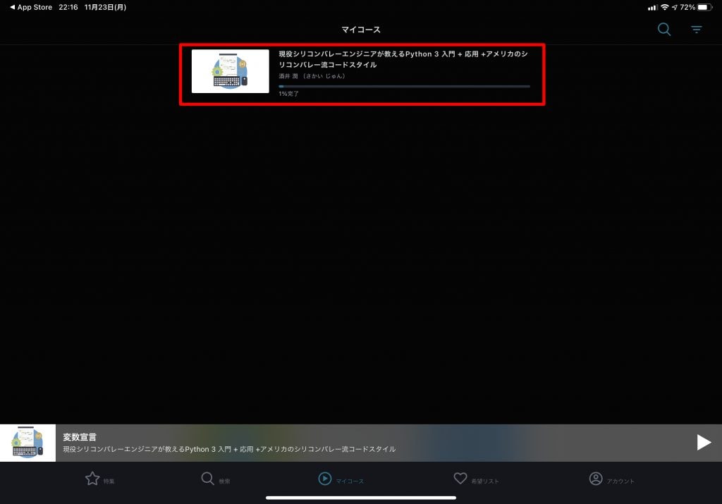 前回購入した「Python 3 入門 + 応用 +アメリカのシリコンバレー流コードスタイルを学ぶオンライン講座 」が一覧に表示されています。
