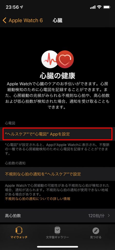 「心臓」内にある「心電図」の「”ヘルスケア”で”心電図”Appを設定」をタップします。
