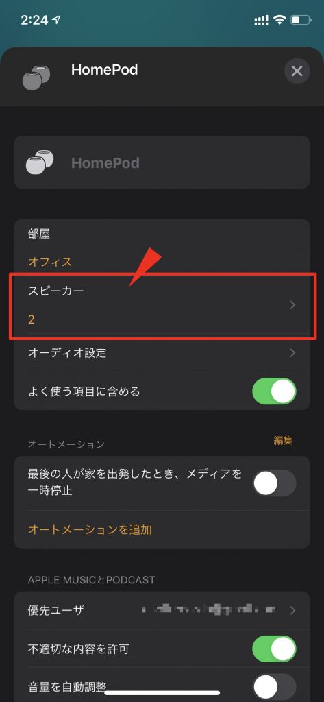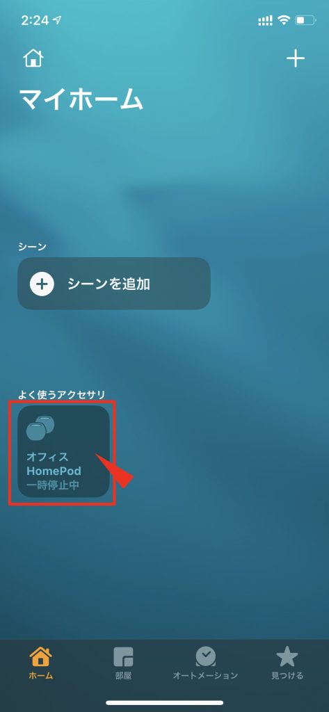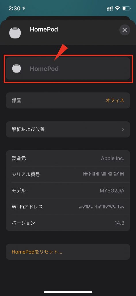 HomePodの画面が表示されたら上部の「アイコン:HomePod」部分をタップします。