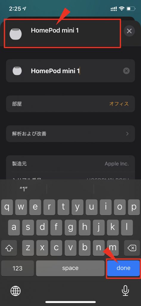 任意の名前を入力します。今回は「HomePod mini 1」と「HomePod mini 2」とそれぞれ名前をつけました。