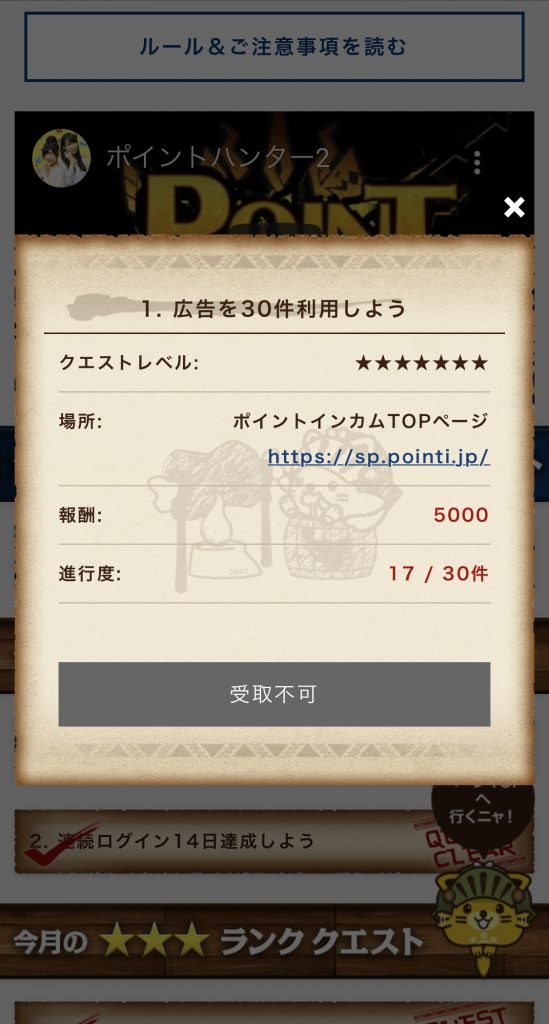 「ポイントインカム」で毎月開催されている「ポイントハンター」は、指定の条件をクリアすることでランクごとに25ポイント〜1,000ポイントをもらえるイベントです。