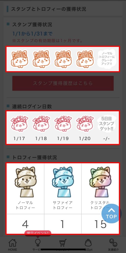 連続ログイン日数が5になると、スタンプを1個獲得でき、スタンプを5個集めると「ノーマルトロフィー」が貰えます。「ノーマルトロフィー」を獲得すれば「ガラポン」を1回回すことができます。