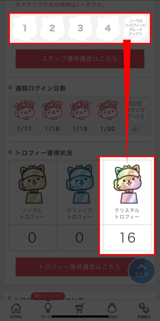 さらに「ノーマルトロフィー」を5個集めると「サファイアトロフィー」獲得で2,000pt、「サファイアトロフィー」を2個で「クリスタルトロフィー」獲得でき、5,000ptもらうことができます。