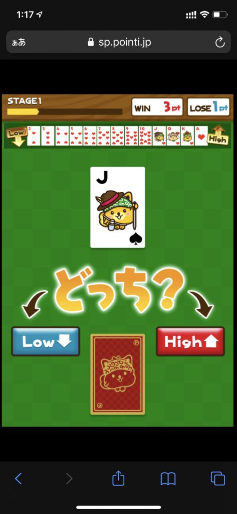 ポイントを稼ぐのにお勧めは、1日一回挑戦できる「High or Low」です。