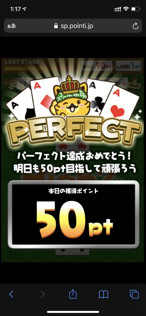 出されたカードより「Low」か「Hight」を選んで正解し続ければ最大50pt獲得できます。