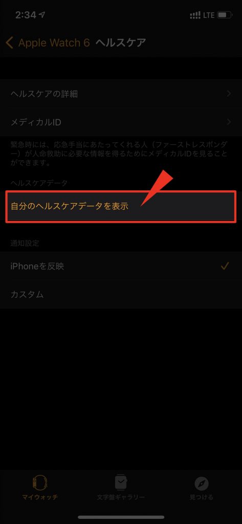 Watchアプリから行う場合は、Watchアプリを起動し、「ヘルスケア」をタップし、「自分のヘルスケアデータを表示」をタップします。