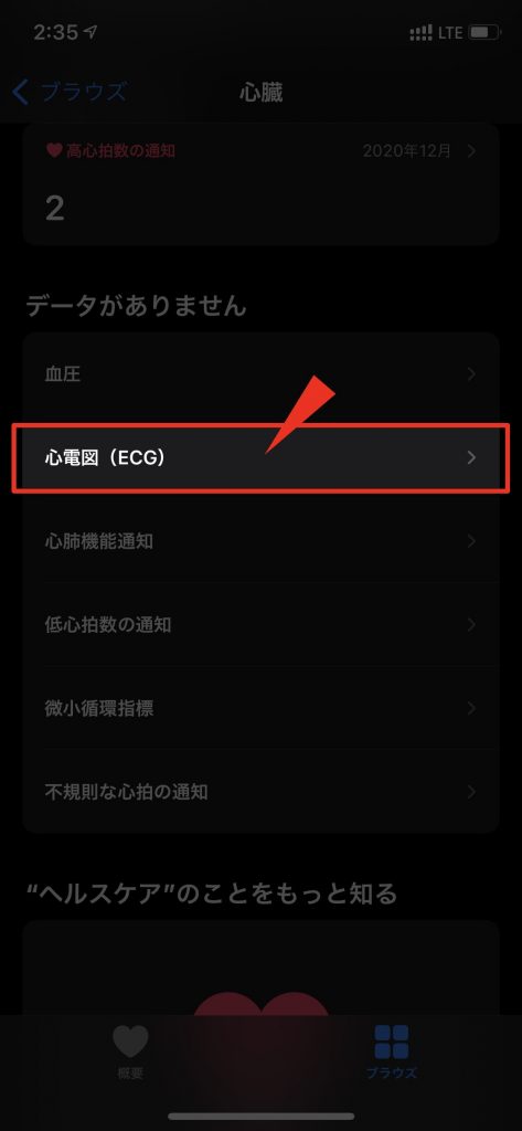ヘルケアアプリが起動したら「心臓」「心電図(ECG)」の順に進みます。