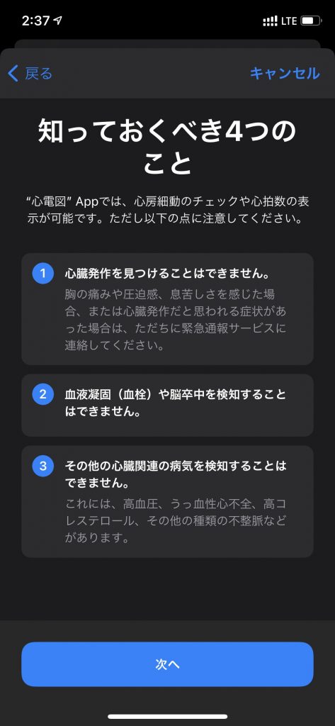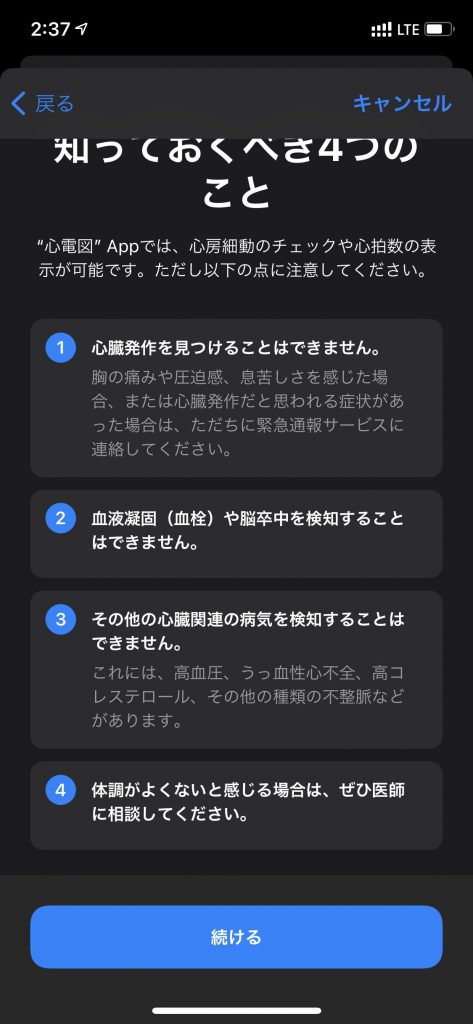 心電図Appの仕組みなどの説明が表示されたのち、続けるをタップします。