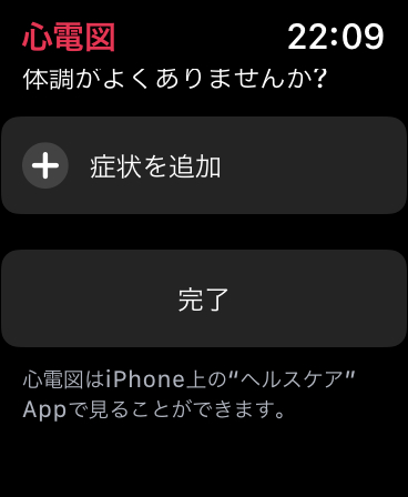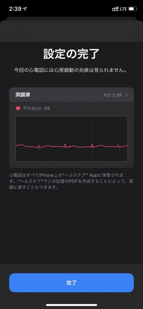 Apple Watchの心電図Appでの計測が完了すると、iPhoneに「設定の完了」が表示されます。