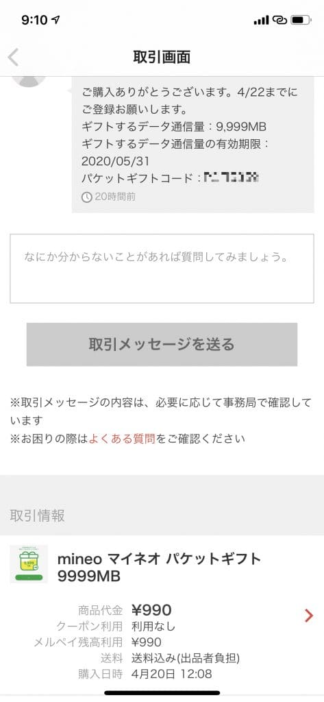パケットギフトを販売している出品者は、どの方も数分から数時間でメッセージにてパケットギフトを送ってきてくれます。