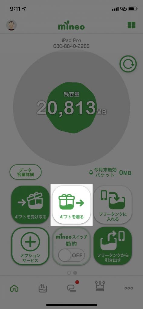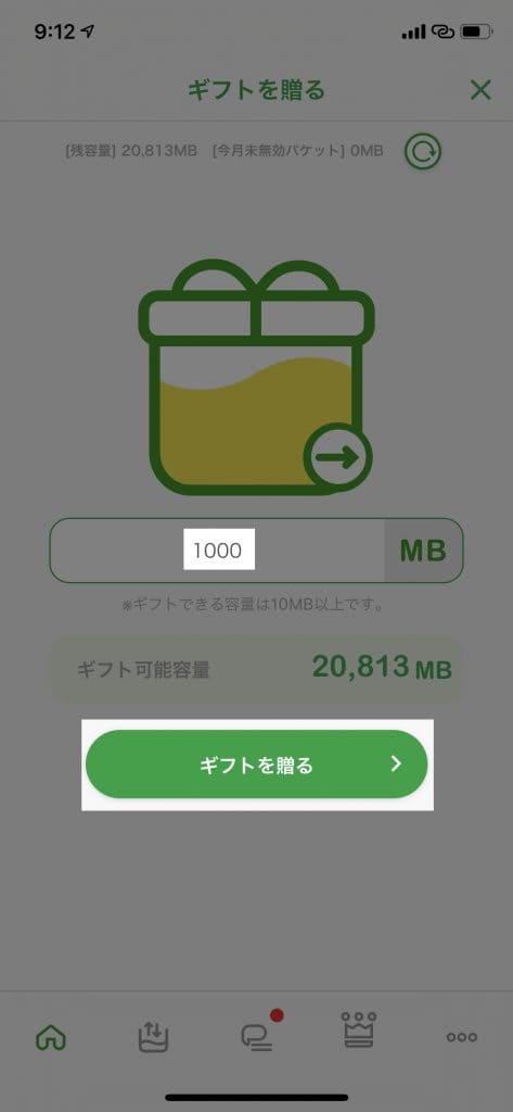 「ギフトを贈る」をタップし、送りたいパケット数を入力(最大9999MB)し、「ギフトを贈る」をタップします。