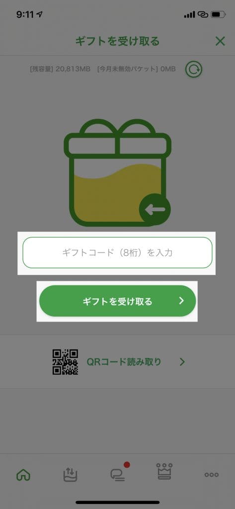 「ギフトを受け取る」をタップし、先ほどコピーしたコードをペーストし「ギフトを受け取る」をタップで即時に反映されます。