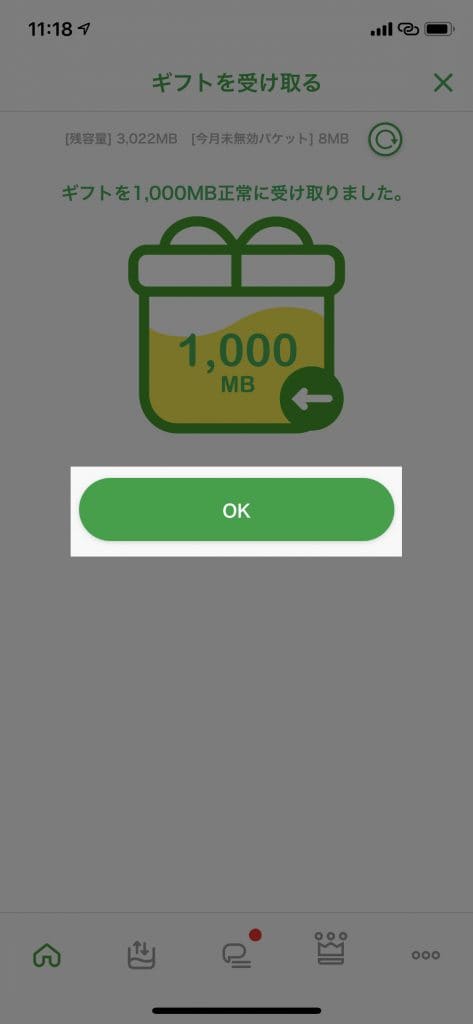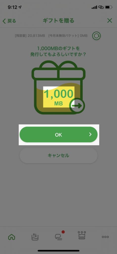 受け取るパケット量が表示されるので「OK」をタップします。