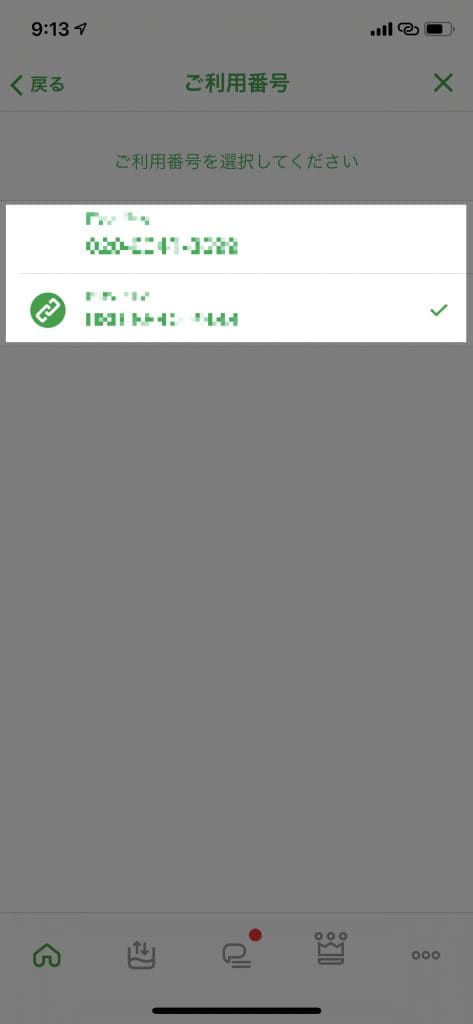 「ご利用番号選択」をタップすると契約している回線番号が一覧で表示されるのでパケットギフトを送りたい番号をタップします。